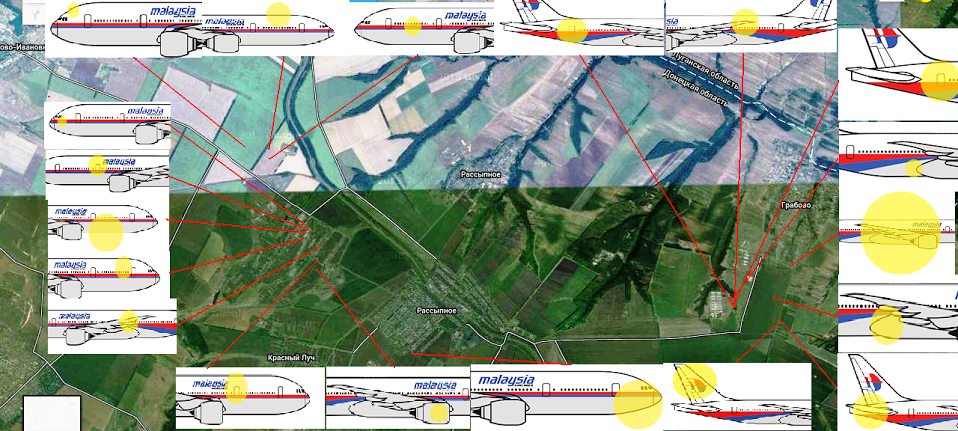 Wenn dieses Bild stimmt, dann wäre das Flugzeug in großer Höhe vollständig zweigeteilt worden - das passt nun aber so gar nicht zur Detonation eines Splittergefechtskopfes nahe der Nase.