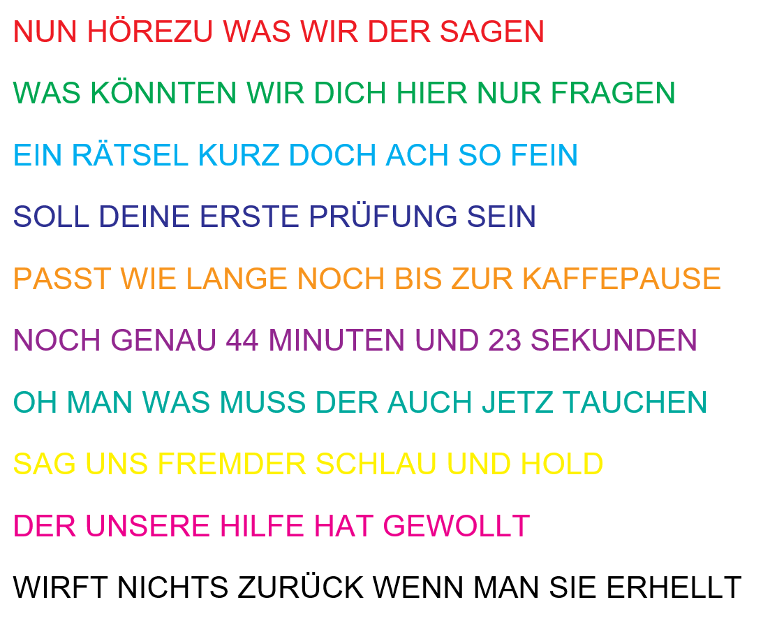 "Eine gute Antwort.", lobt dich die Priesterin. "Ist euch aufgefallen, das euer vorletzter Reim nicht ganz sauber ist?", fragst du zurück. "Ähm, ja...!". Die Frau wirkt etwas verlegen. "Wir dachten, du kämest etwas später und wir mussten improvisieren." Du musst grinsen: "Achso, ja kein Problem." Es ist beruhigend zu sehen, das auch andere Leute so unorganisiert sind wie du.